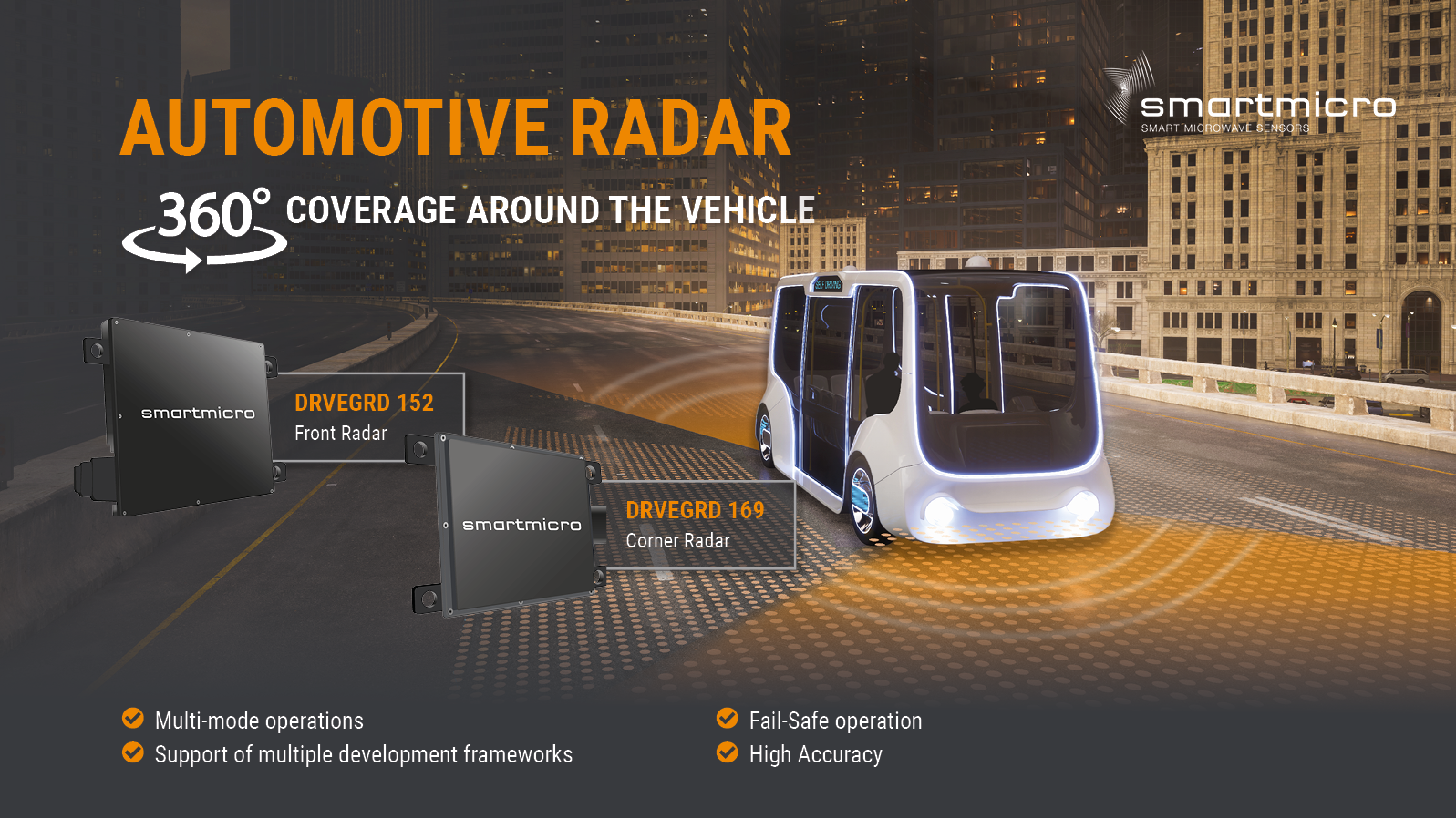 smartmicro’s DRVEGRD® Line of automotive radars enables 360° coverage around the vehicle, enabling the safe mobility of people and material. Learn more about each model and discover which one is the perfect choice for your application.
