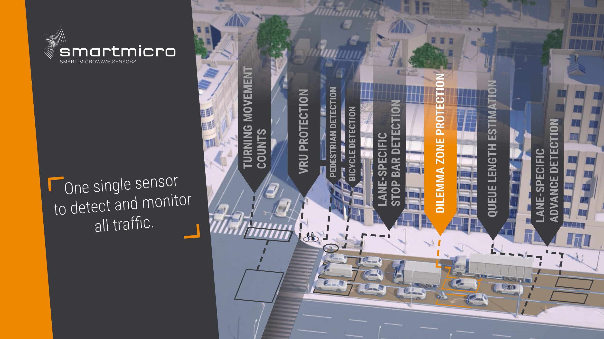 The smartmicro Event Trigger Module can be used to make the dilemma zone safer. Based on precise lane-specific object data like position, speed, and class of every traffic participant, the traffic signal timing can be adapted in real-time. The smartmicro sensor can simply calculate the ETA and the controller can adjust the timing accordingly. This way, dangerous situations can be avoided and the safety of all traffic participants is increased.