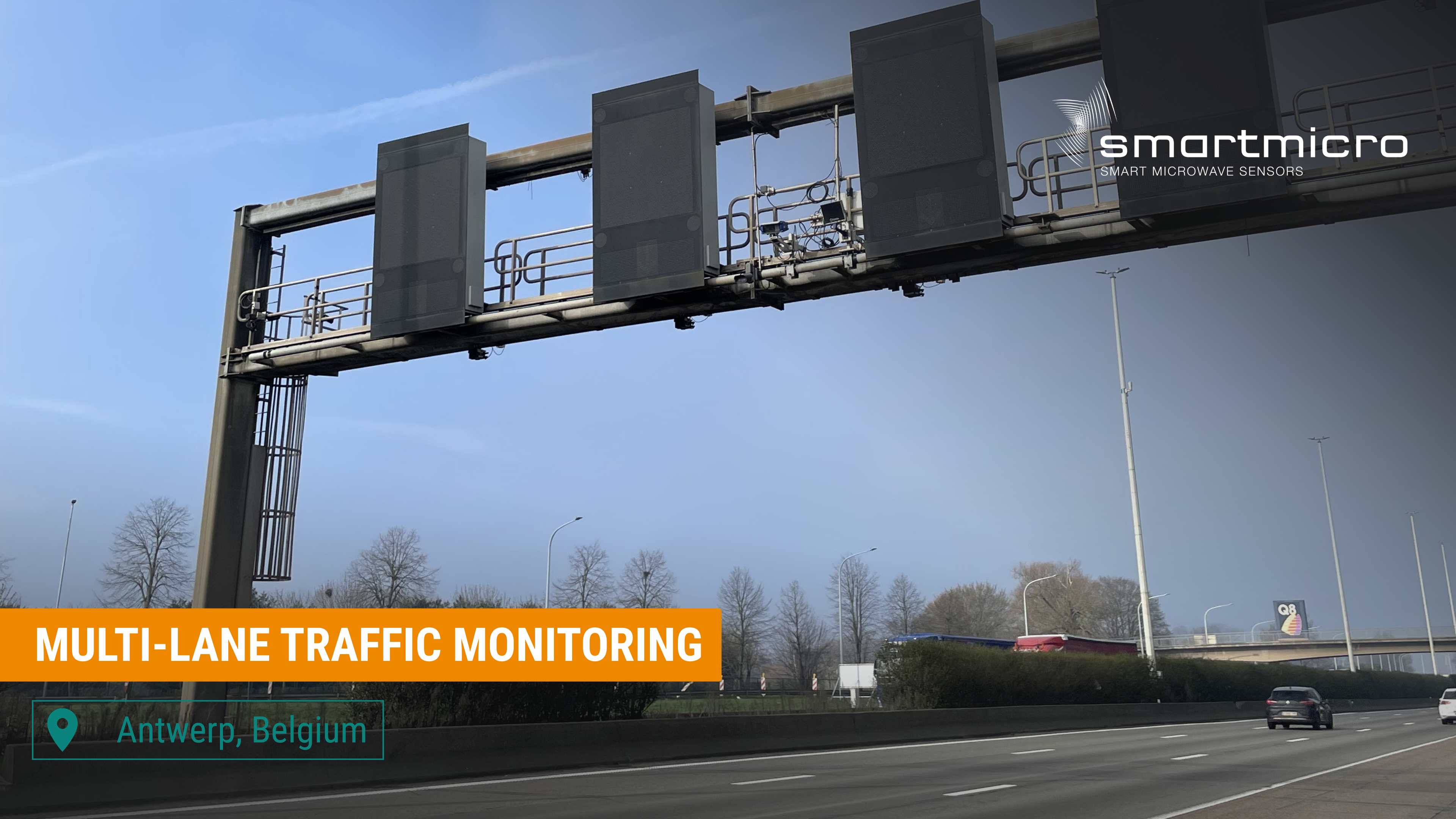 A smartmicro UMRR-11 Type 132 radar sensor was installed on a highway gantry to monitor four motorway lanes towards Antwerp.