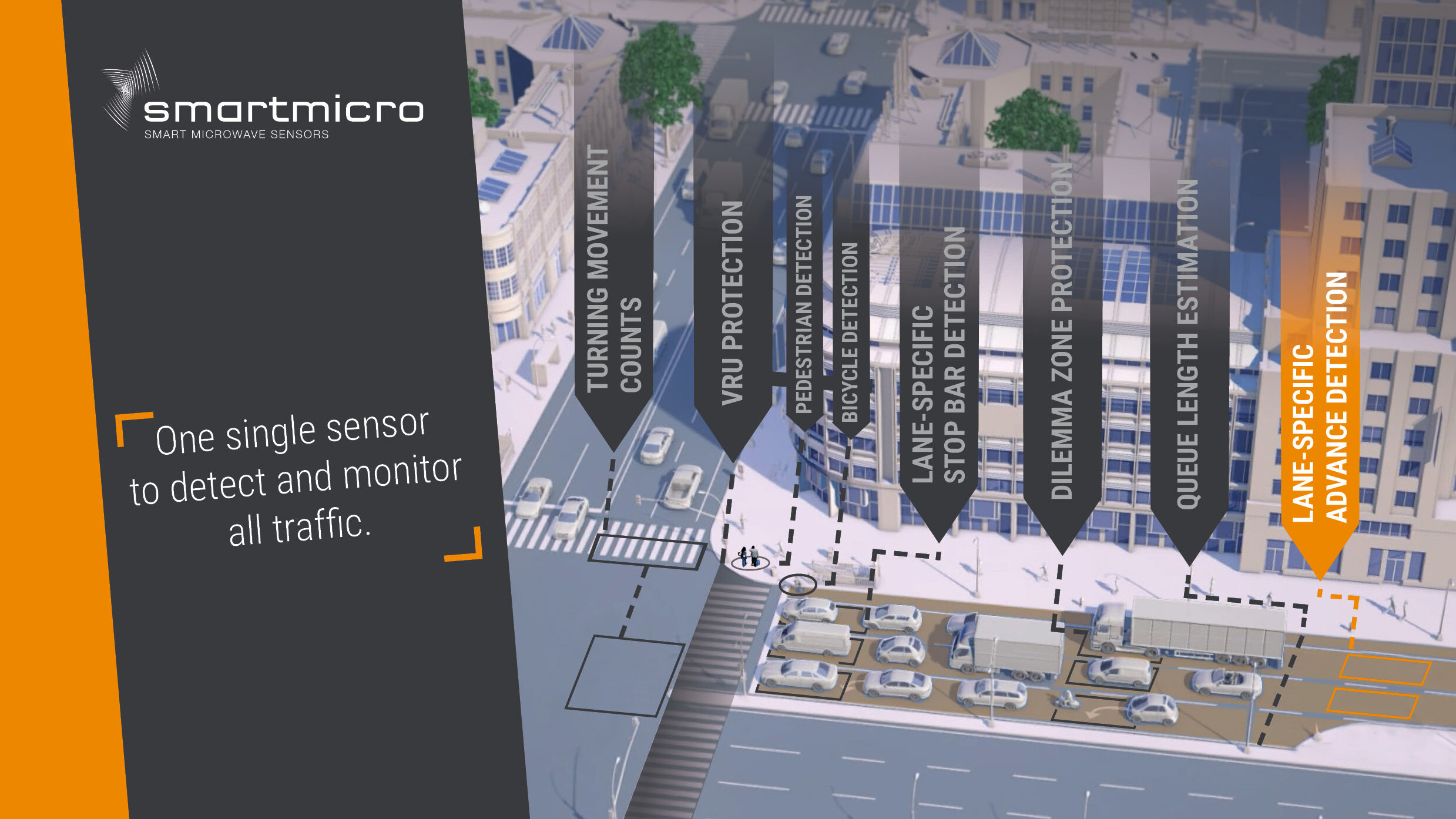 Lane-specific advance detection zones of our sensors can be configured for every intersection. Such zones enable, for example, the extension of the green light phase in real-time for vehicles with a specific distance to the intersection (dilemma zone). Due to the high range of up to 300m, our sensors can also easily handle intersections with higher speed limits, where advance detection zones need to be further away from the stop bar.