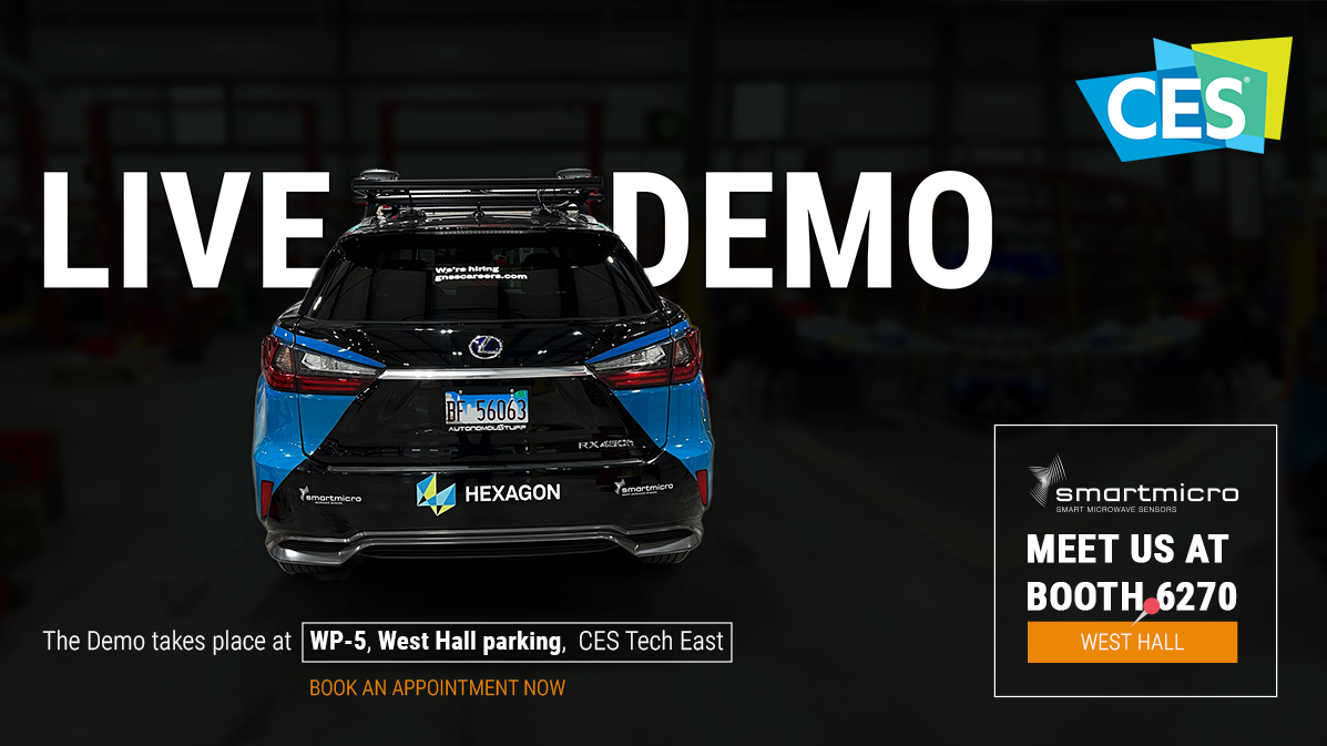 Hexagon, one of our automotive partners, is hosting a Live Demo with a vehicle equipped with smartmicro’s front radar DRVEGRD 152 and corner radar DRVEGRD 169. The Demo takes place at WP-5, West Hall parking, CES Tech East. You can reserve your time slot directly through Hexagon’s page here: https://www2.hexagonpositioning.com/CES-Demo-2023