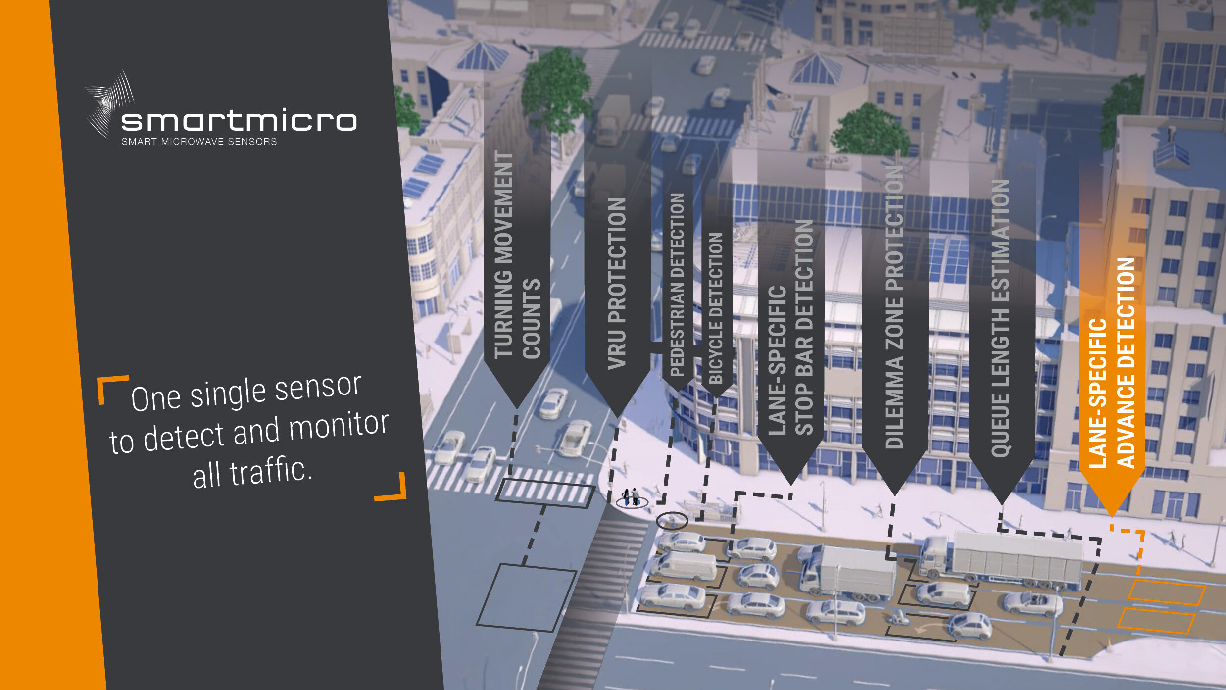 Lane-specific advance detection zones of our sensors can be configured for every intersection. Such zones enable, for example, the extension of the green light phase in real-time for vehicles with a specific distance to the intersection (dilemma zone). Due to the high range of up to 300m, our sensors can also easily handle intersections with higher speed limits, where advance detection zones need to be further away from the stop bar.