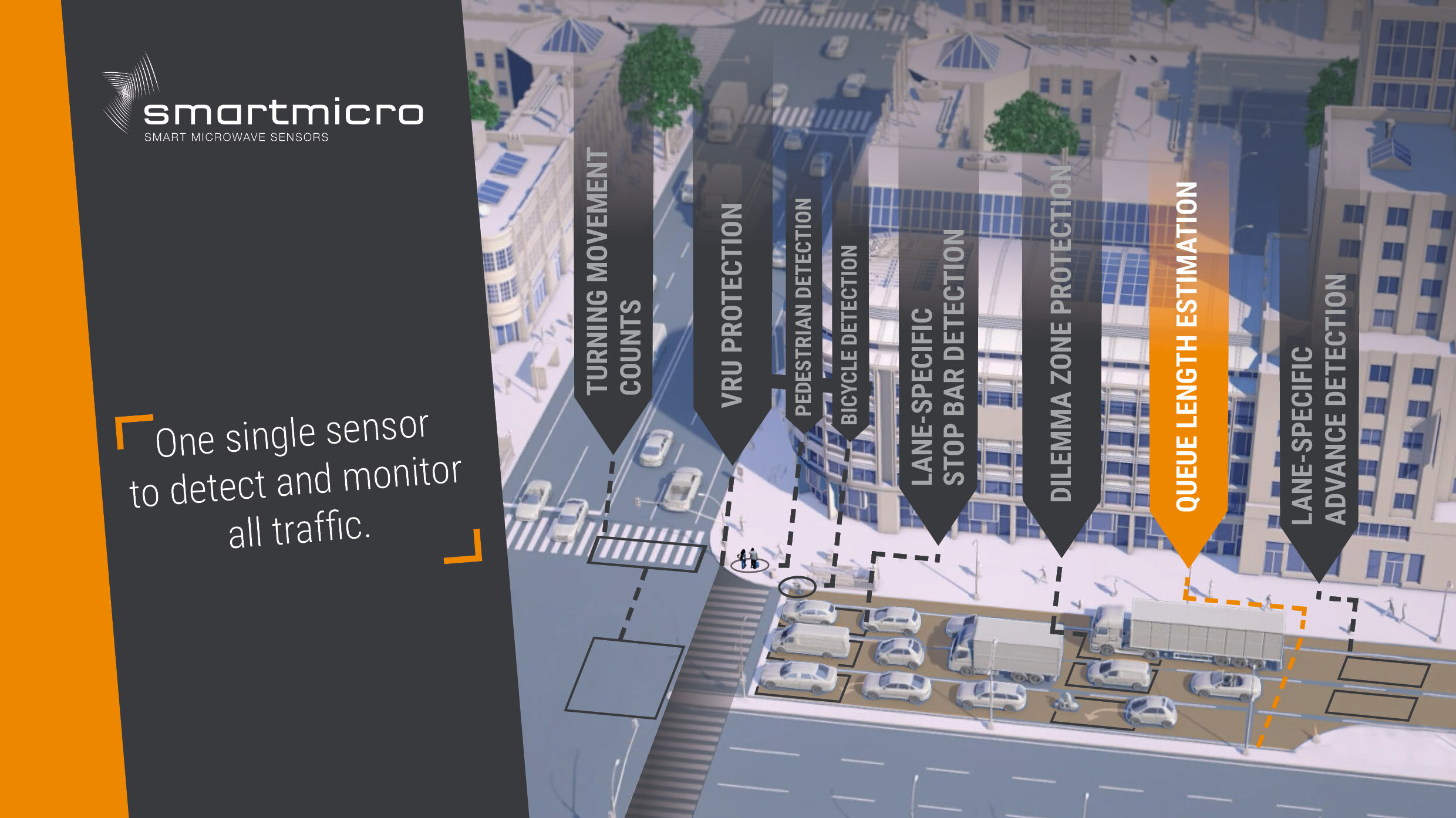 One element to avoid congested intersections that result in delays and pollution, is to monitor the approaches more efficiently. Using the Queue Length Estimation (QLE) feature of smartmicro sensors, all arriving traffic is detected and the number of queued vehicles or queue length is measured. This information can be used for adaptive traffic light control, improving the performance of the intersection.